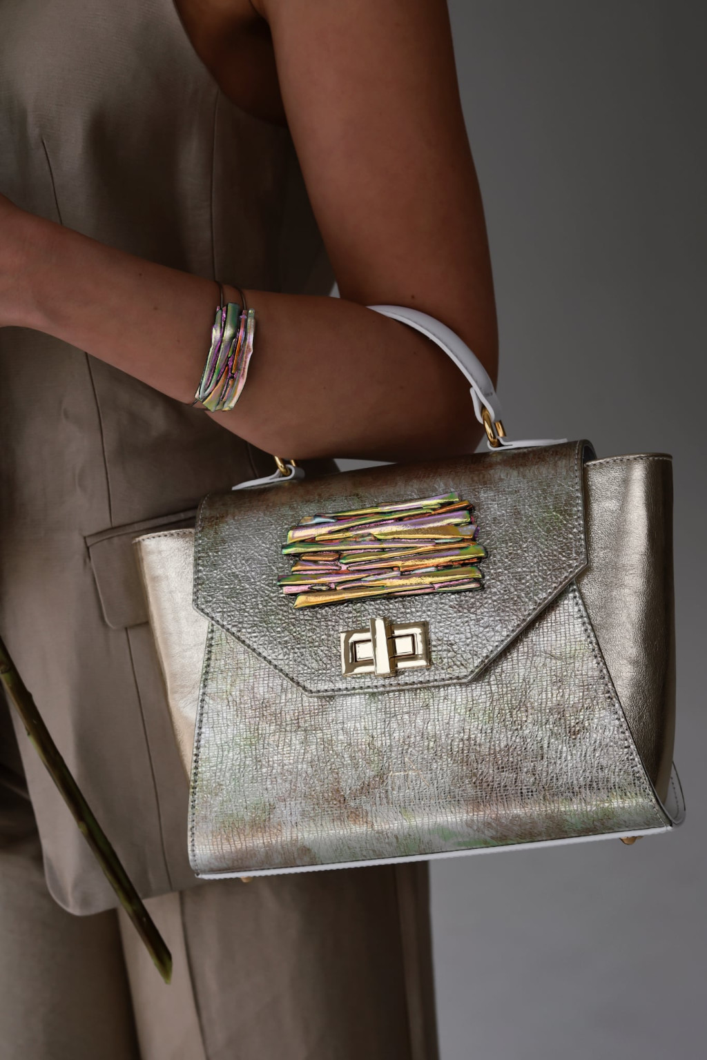 Az üvegdíszek kifejezetten táskákra fejlesztett, edzettebb üveganyagból készültek, hogy a metálfényű bőrök mellett is erős, karakteres jelenlétük legyen ékszerszintű statement. A formák egységesek, a színvariációk merészek; minden darab a fény játékára hangolt találkozás Hodlik Anna bőrvilága és az MJ glass design irizáló üvegcsodái között.