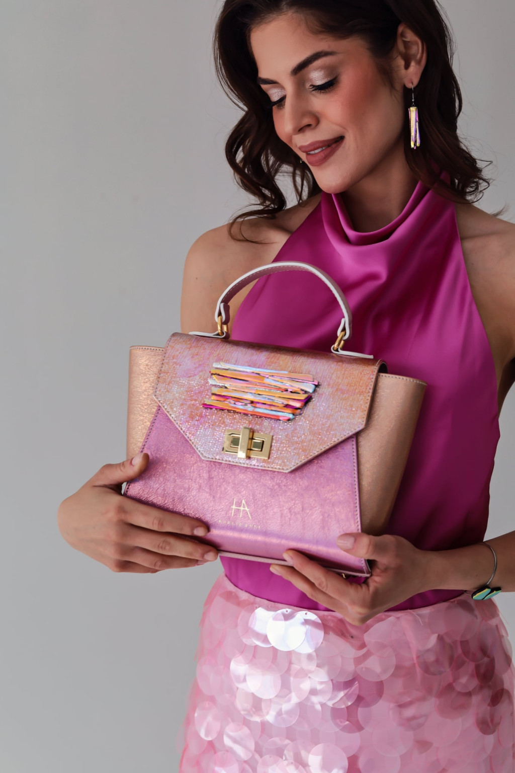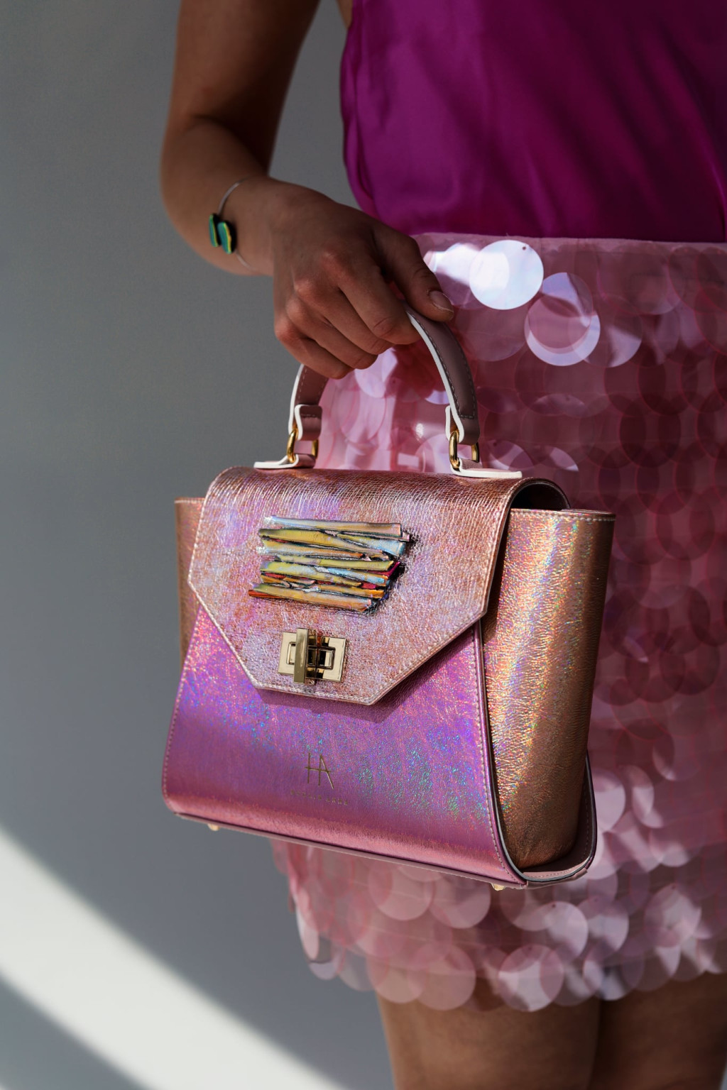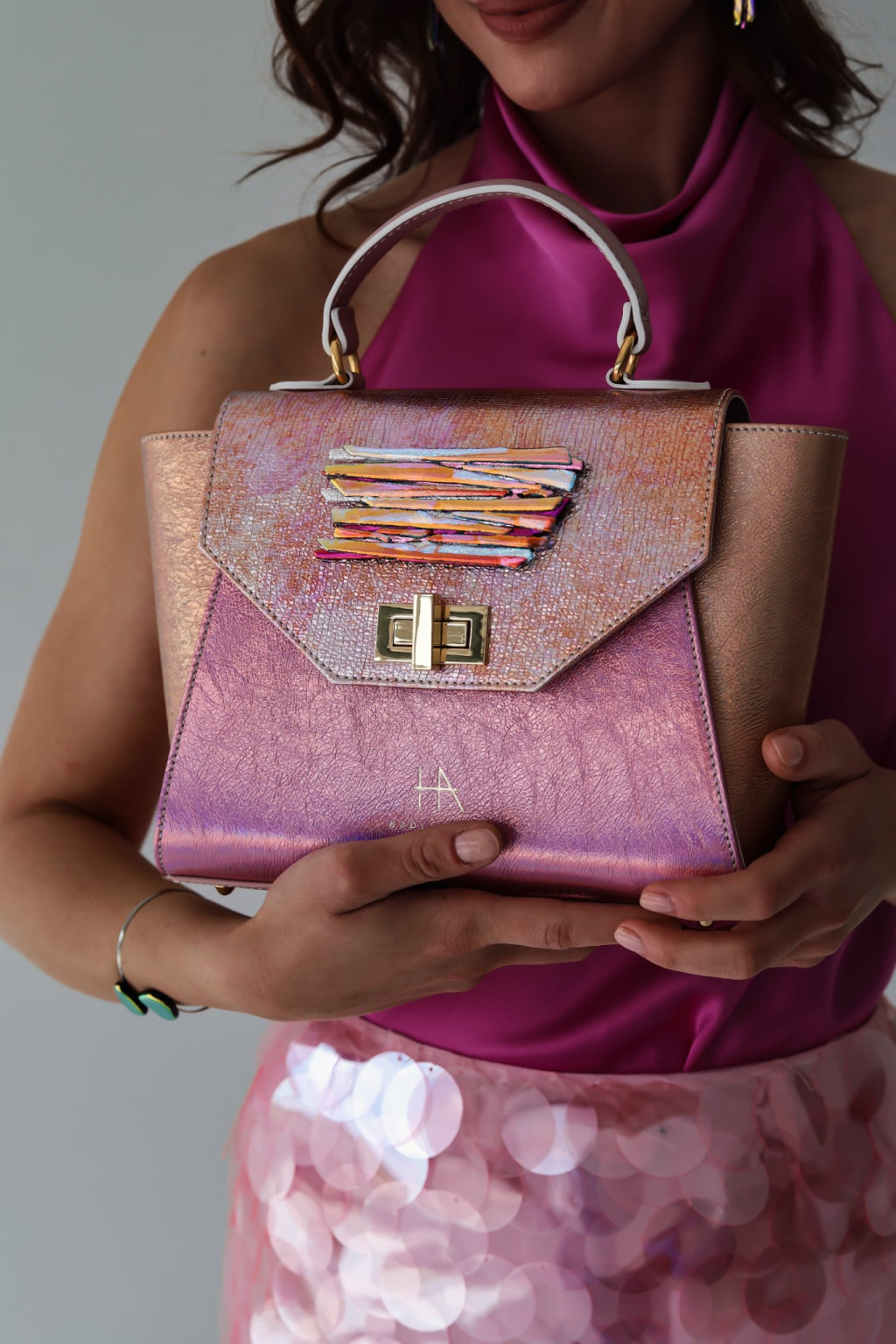 Az üvegdíszek kifejezetten táskákra fejlesztett, edzettebb üveganyagból készültek, hogy a metálfényű bőrök mellett is erős, karakteres jelenlétük legyen ékszerszintű statement. A formák egységesek, a színvariációk merészek; minden darab a fény játékára hangolt találkozás Hodlik Anna bőrvilága és az MJ glass design irizáló üvegcsodái között.