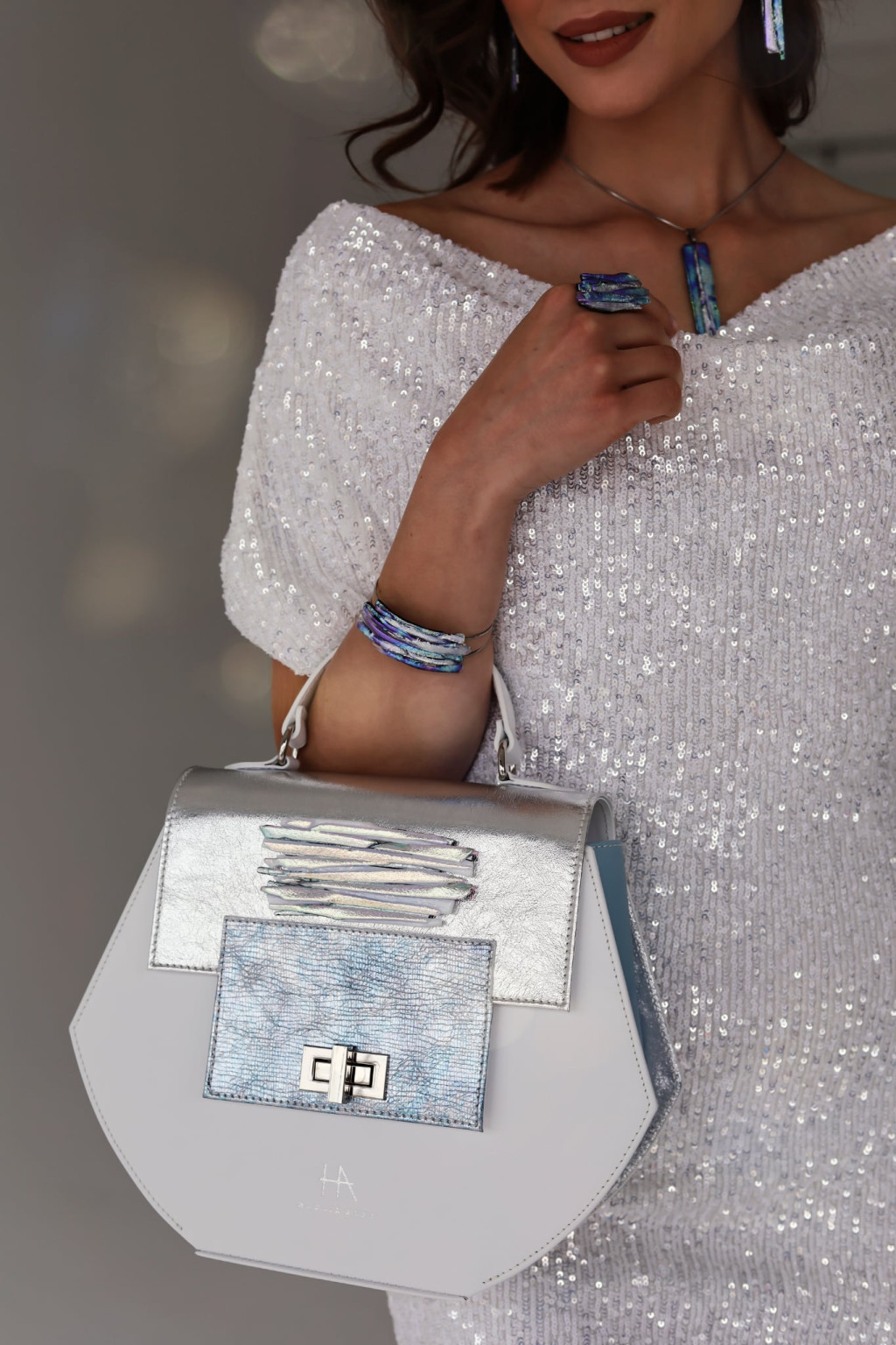 Az üvegdíszek kifejezetten táskákra fejlesztett, edzettebb üveganyagból készültek, hogy a metálfényű bőrök mellett is erős, karakteres jelenlétük legyen ékszerszintű statement.